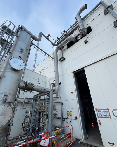 100 M€ ont été investis pour l’usine Hyd’Occ et son réseau de distribution. L’usine produira 20 MW (en première phase) grâce à ses quatre paires d’électrolyseurs. Ils sont alimentés par un courant de 400 volts continu. La première étape consiste donc à transformer les 63 000 volts alternatifs fournis par RTE. Une fois l’électrolyse effectuée – grâce à une eau purifiée de tous ses sels minéraux et accélérée par l’hydroxyde de potassium -, il faut compresser l’hydrogène. À 80 bars d’abord puis à 450 bars ensuite. Indispensable pour le transport, cette étape n’est pas encore opérationnelle à Hyd’Occ. Une fois compressé, l’hydrogène est chargé grâce à des camions spéciaux, des tubes trailers, qui emportent avec eux 1 tonne d’hydrogène à destination d’une station de recharge où la “remorque” pleine est laissée pour alimenter en direct la station. Le camion repart immédiatement avec la vide. À l’usine, le chargement se fait en permanence, au fur et à mesure, de la production qui s’établira à 2 700 tonnes à l’année.