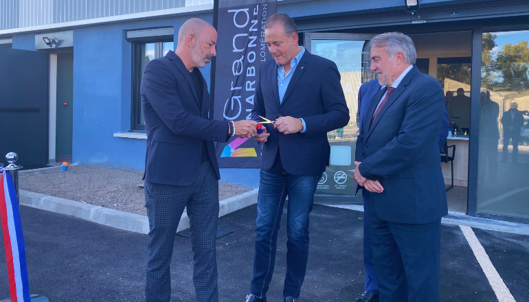Bertrand Malquier, président du Grand Narbonne, et sa singulière technique de découpe des rubans inauguraux. ©A.G.